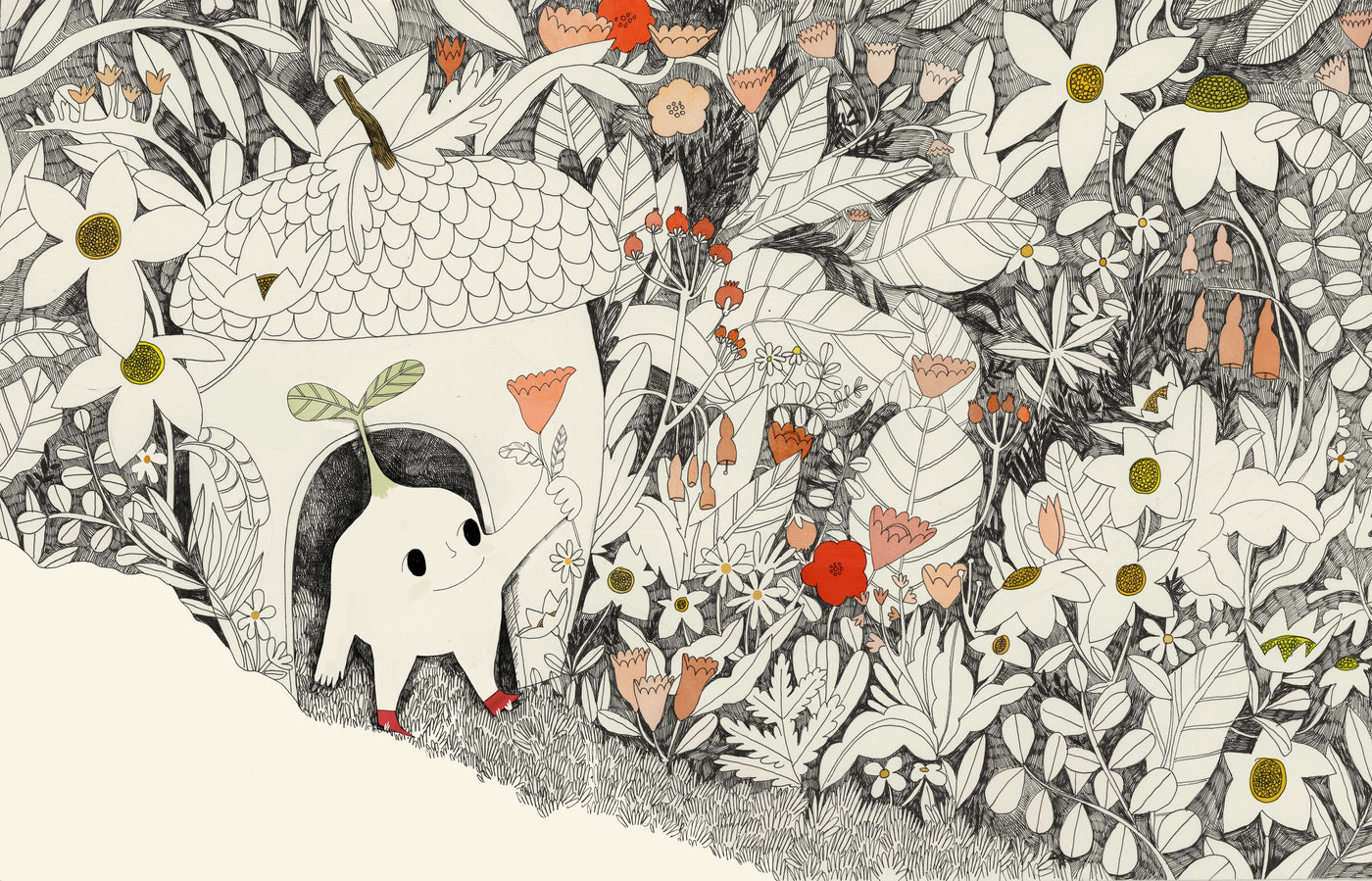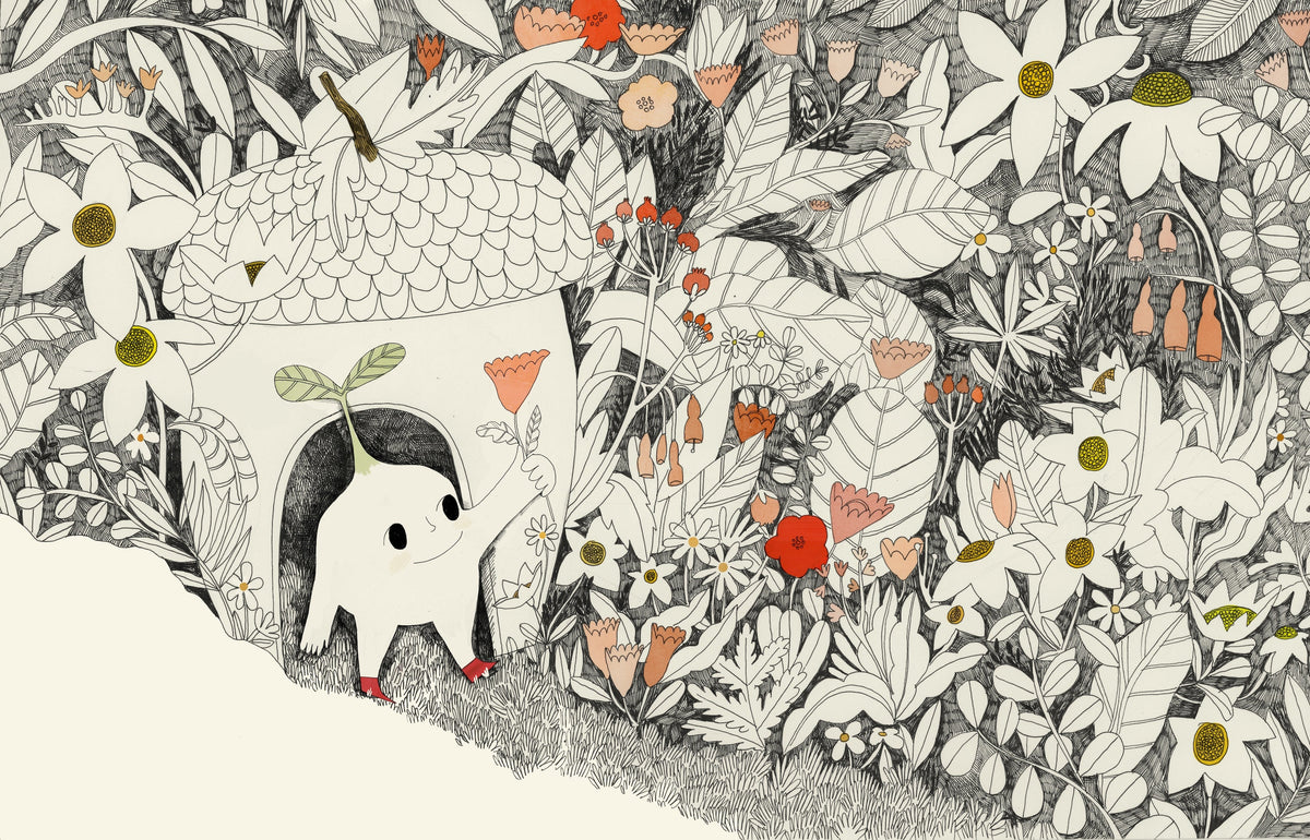 The illustration from the book 'My Self, Your Self' shows SELF with a sprout growing from their head, conveying a sense of personal growth or introspection. The character is surrounded by an intricate tapestry of flora, including large flowers and diverse plants, rendered in a delicate line art style with selective touches of muted colors. The composition creates a whimsical, dense garden, suggesting a rich inner world or the passage of time spent in self-reflection amongst the beauty of nature.