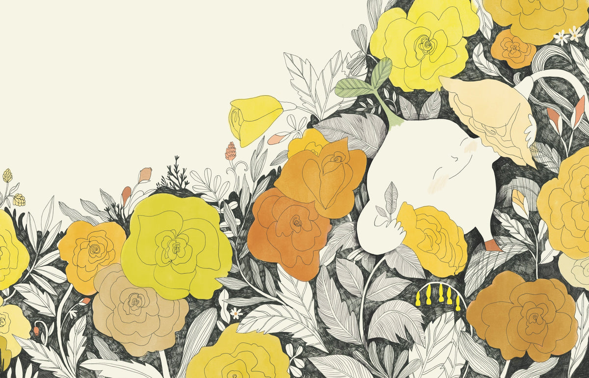 The illustration from the book 'MY SELF, YOUR SELF' depicts a serene and contemplative scene of SELF nestled among oversized roses. The flowers, in shades of yellow and orange, dominate the frame with their lush, detailed petals and dark foliage, contrasting with the gentle cream-colored background. The figure is rendered in a minimalist style, in a state of peaceful repose, evoking a sense of tranquility and connection with nature.