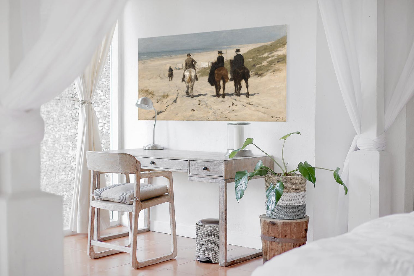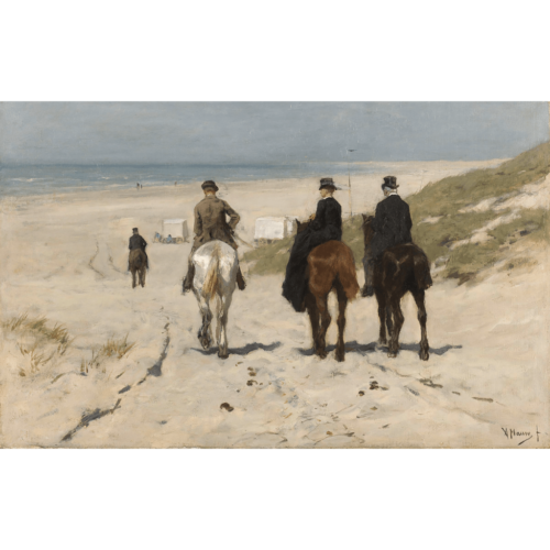 The painters of the Hague School had a preference for the poor fishermen's life, such as that which took place in nearby Scheveningen. However, Mauve shows the other side of the fishing village here: the sunny world of wealthy citizens. Three riders descend to the beach, where the bathing carriages are ready for the swimmers. The blonde and blue colors well reflect the salty atmosphere of a summer day at the beach.