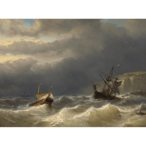 Storm in the Strait of Calais. Ships at sea near a coast during a storm.