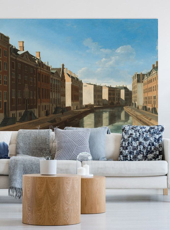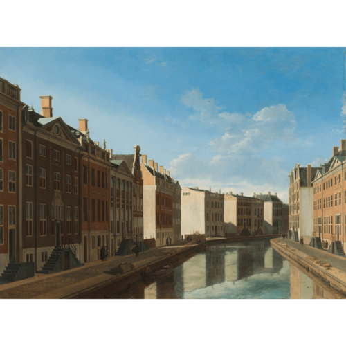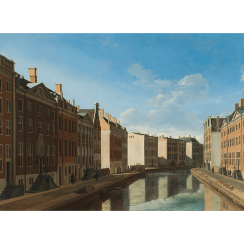 View of Amsterdam's Herengracht under construction, seen from the bridge of the Vijzelstraat. Bend with canal houses built in classicist style on the Herengracht with the entrance to the Nieuwe Spiegelstraat on the left. Sunlight falls between the still unfinished row of façades and reflects on the water of the canal. Building materials are scattered on the quay. Fences shield the undeveloped plots from the public road. The last building on the south side of the canal is still under construction.