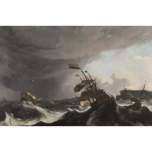 In early 1694 some 30 Dutch warships set sail for the Mediterranean. They were sent to protect a merchant fleet from French attacks. In the Straits of Gibraltar they ran into a heavy storm. Various ships sank or were seriously damaged, including the Hollandia, portrayed centre right in the painting.