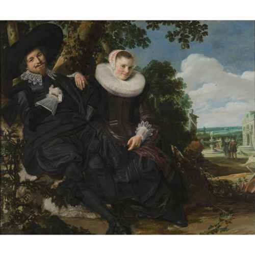 Wedding portrait of Isaac Abrahamsz Massa and Beatrix van der Laen, married in Haarlem on 25 April 1622. The couple is seated on a platform under a tree. A thistle on the left, ivy on the right. In the background on the right, elegant couples walking in a garden with a fountain at a country house. This happy, smiling pair sits comfortably close to each other. Posing a couple together in this way was highly unusual at the time. It may have been prompted by the sitters’ friendship with the painter and the occasion for the commission – their marriage in April 1622. The painting thus contains references to love and devotion, such as the garden of love at right, and at left an eryngium thistle, known in Dutch as ‘mannentrouw’, or male fidelity.