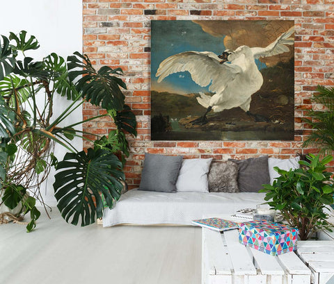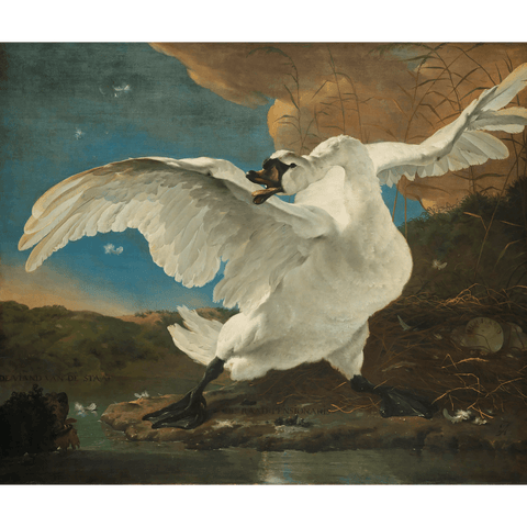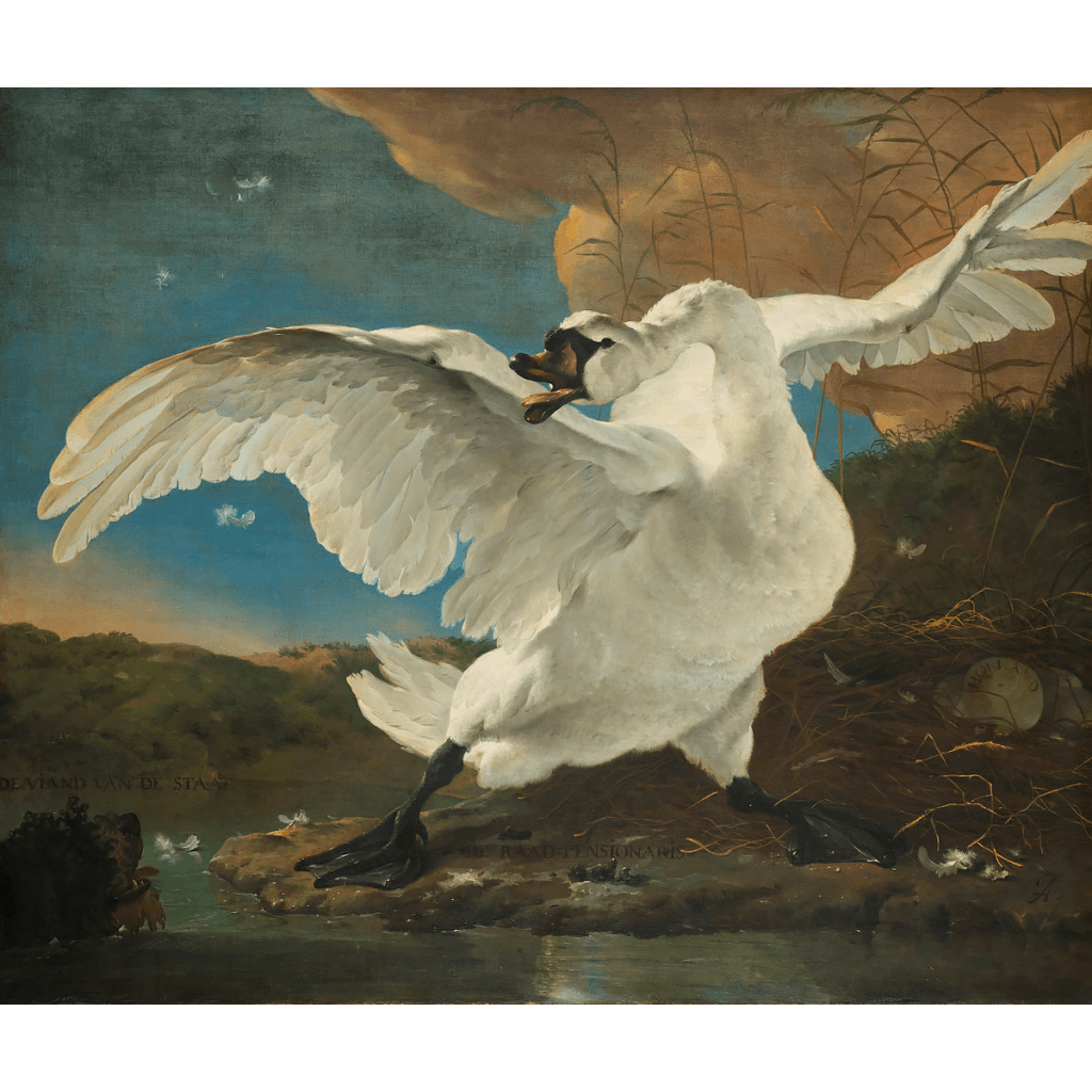 A swan energetically defends her nest against a dog. In later centuries, the fight was interpreted politically: the white swan was conceived as the statesman Johan de Witt, who was murdered in 1672, who defends the country against his enemies. With this interpretation, the painting was the first acquisition in the National Art Gallery (the predecessor of the Rijksmuseum) in 1800.