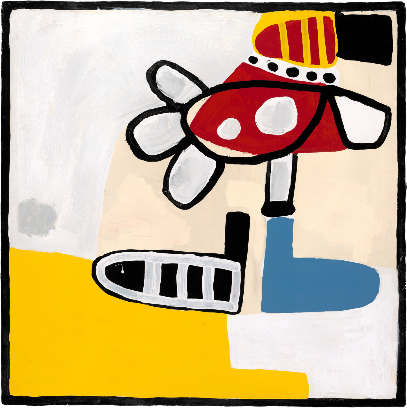 In this whimsical composition, Cronin presents a playful abstraction that teeters between representation and pure form. A central red figure, reminiscent of a childlike drawing, dominates the canvas. This figure, adorned with a striped hat, floats above a landscape of geometric color blocks in yellow, blue, and white. Cronin's signature bold outlines define the shapes, creating a stark contrast against the softer color fields. The artist's use of primary colors and simple forms evokes the aesthetics of early modernism and children's art, while the spatial ambiguity and abstract elements root the work firmly in contemporary practice. Through this piece, Cronin invites viewers to engage with the tension between naivety and sophistication, challenging perceptions of artistic complexity and expression.