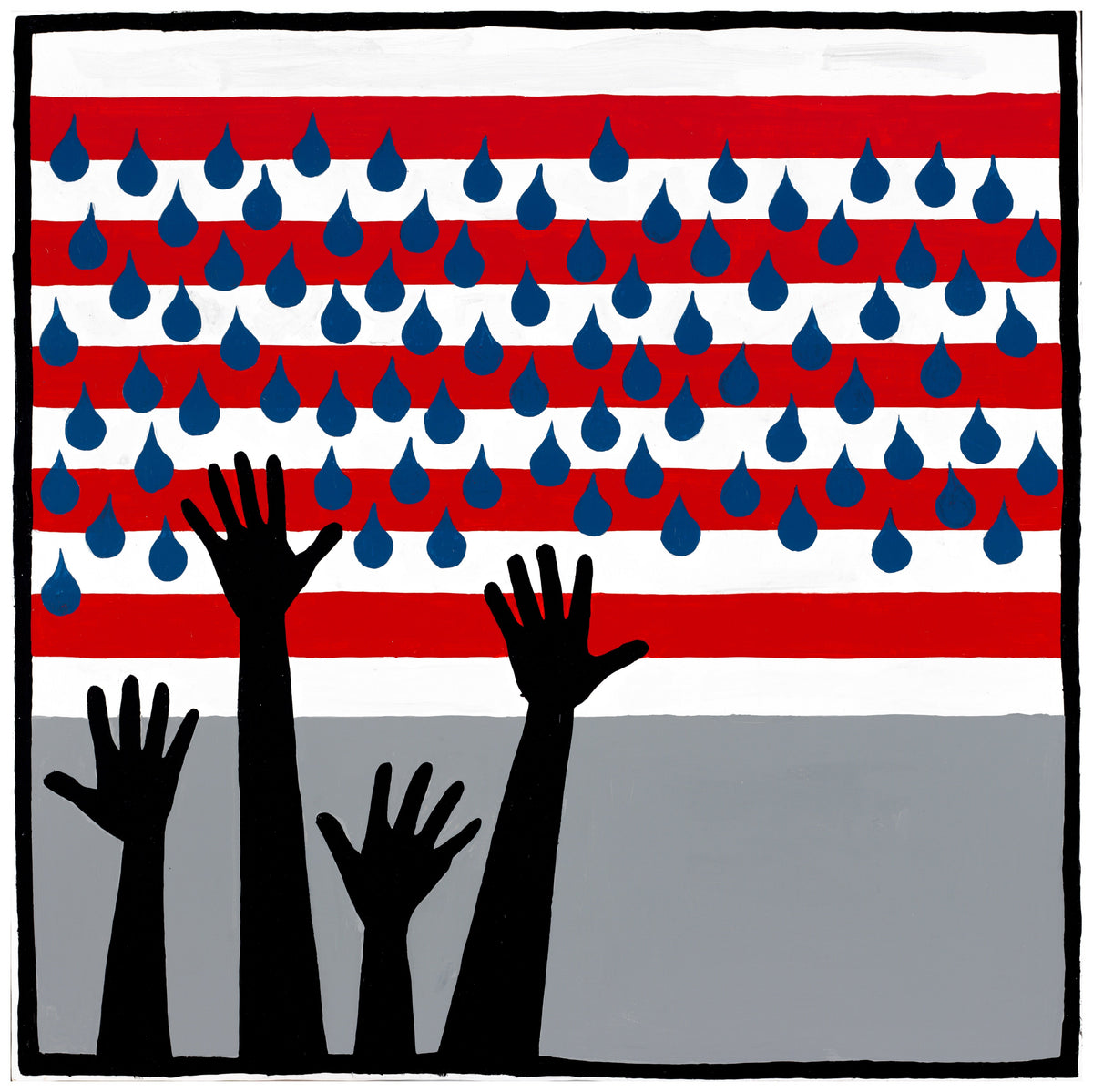 In this striking composition, Cronin presents a powerful commentary on contemporary American society. The upper portion of the canvas is dominated by a stylized American flag, its stripes interspersed with blue teardrop shapes, creating a visually arresting pattern that subverts traditional patriotic imagery. Below, silhouetted hands reach upwards against a gray backdrop, their gestures suggesting both supplication and protest. Cronin's bold use of color and form, characteristic of his style, here takes on a somber tone, inviting viewers to contemplate the complex relationships between national identity, civic engagement, and social justice. The work's stark symbolism and emotive power demonstrate Cronin's keen ability to distill pressing societal issues into compelling visual metaphors, reflecting his deep engagement with the world around him and his commitment to provoking thoughtful discourse through art.