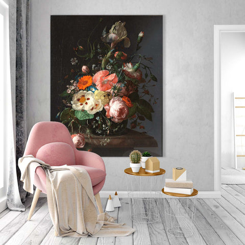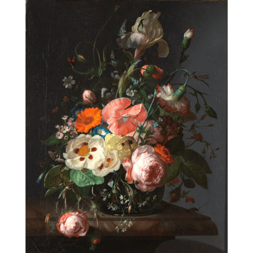 Still life with flowers in a glass vase on a marble tabletop. Bouquet with roses, poppies, irises, carnations and bindweed in a blue glass vase. Between the flowers all kinds of insects.