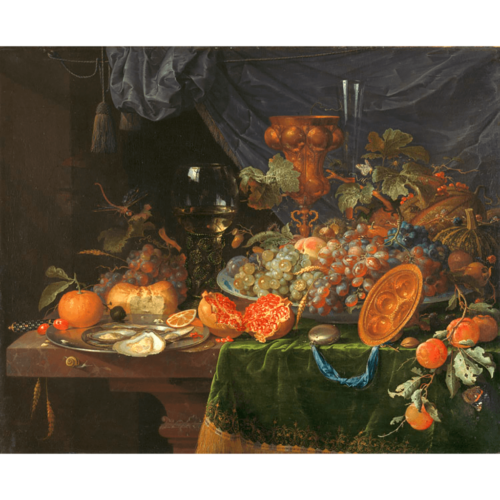 Still life with fruits. On a stone plinth in the middle a bunch of white grapes with peaches, plums, a sliced pomegranate and half a melon. With butterflies and other insects.
