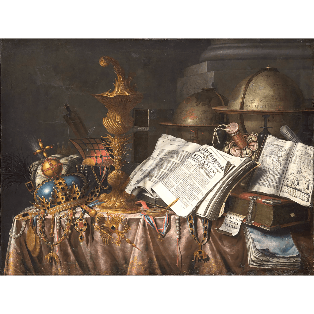 Vanitas still life. On a table next to a column are various books, travelogues and scientific treatises. Some opened, an earth globe and a celestial globe, a money bag, a crown, decorative signs, a watch and a showy cup.