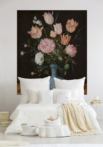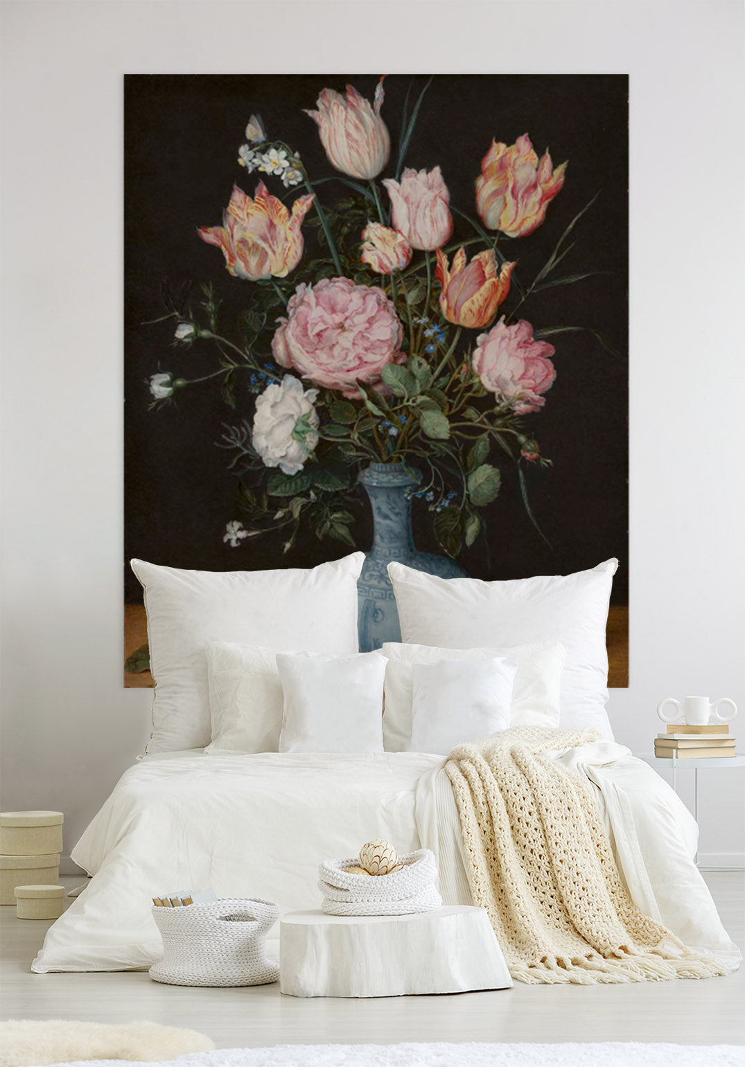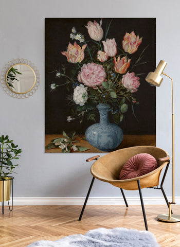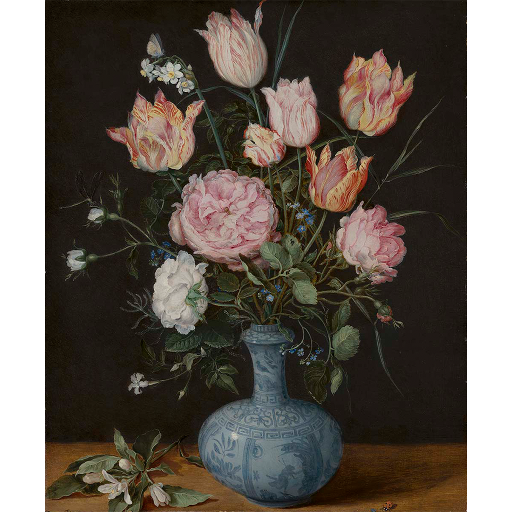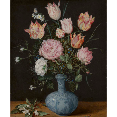 Jan Brueghel the Elder painted so precisely that he was called the Velvet Brueghel. He was the first Fleming to paint flower still lifes and had great success with it. This small bouquet of mainly roses and tulips is in a special vase made of Chinese porcelain. It's a kendi, a Chinese water bottle. Brueghel placed it in front of a dark background, against which the roses, daffodils and flamed tulips stand out beautifully.