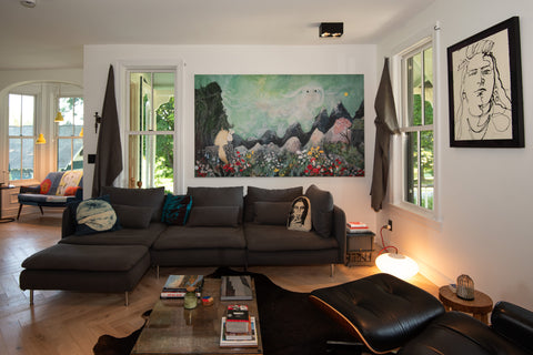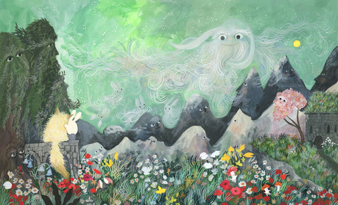 In this ethereal illustration from the book 'A Garden of Creatures,' the little bunny, with the wisdom of her friend, the cat, learns that her friend, the big bunny who passed, is a part of everything around them -- the grass, the air, the leaves -- for the world is a garden of creatures.