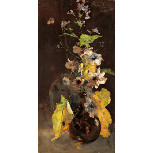 Flower still life with anemones in a brown glass wine bottle with an ear against a dark background. In the background a grey ginger jar.