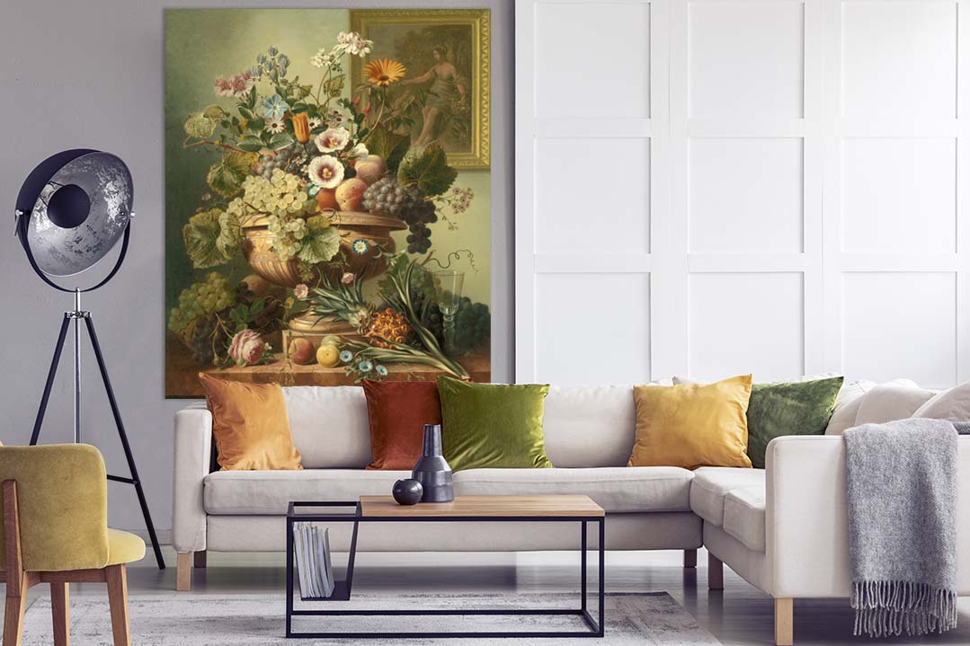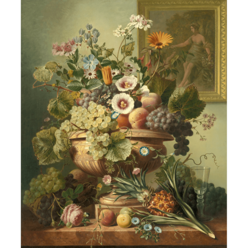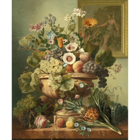 Still life with flowers and fruits. On a plinth is a stone vase with flowers, fruits and vines. On the plinth is a glass and a pineapple, peaches, grapes and a rose. On the wall hangs a painting of a woman with a basket of flowers handing a wreath to a child.
